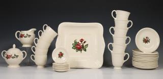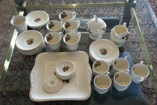 Bestaande uit schaal, melkkan, suikerpot, zes kleine schotels, zes hoge theekoppen, vijf lage theekoppen en tien schotels.
