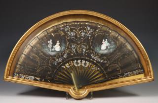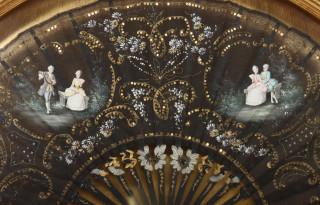 Beschilderd met scenes van galante koppels. Geborduurd met pailletten, houten benen. In goud gelakte vitrine met glasplaat.