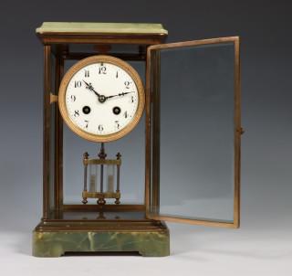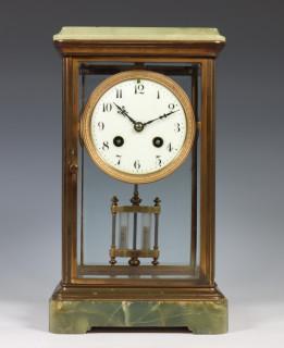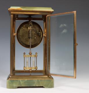Kwikslinger pendule in messing kast met onyx basis en top, ca. 1900.