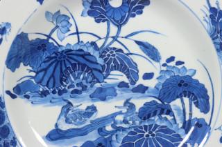China, blue and white porcelain octagonal plate, 19th century, decorated with ducks in a lots pond (nicks) opgekocht v105 ivm kapot gevallen