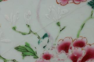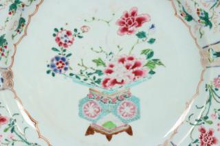 China, famille rose porcelain dish, Qianlong, decorated with central flower vase surrounded by floral panels (cracks, wear)