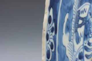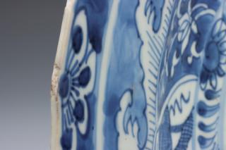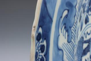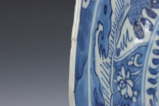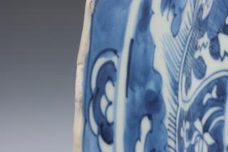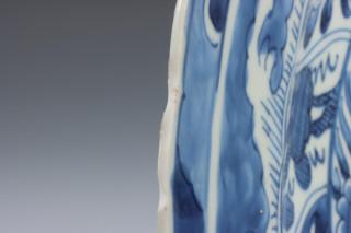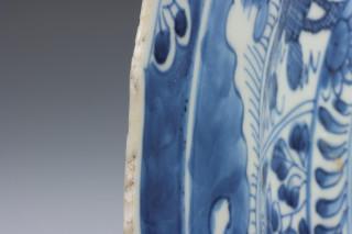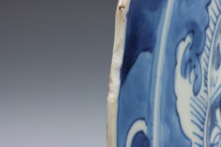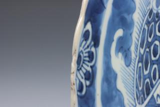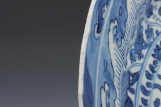 beide gedecoreerd met lotusbloemen rondom een centrale lotus, de randen met panelen met bloemen en een rand van golven (haarlijn, kleine randchips)