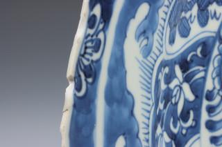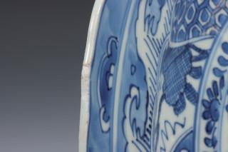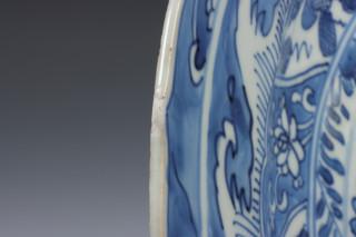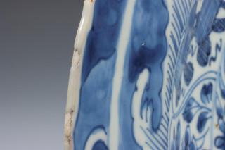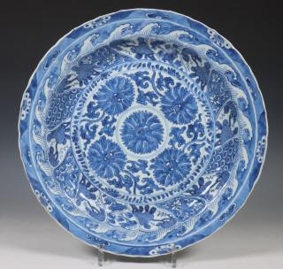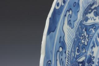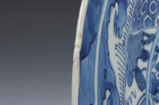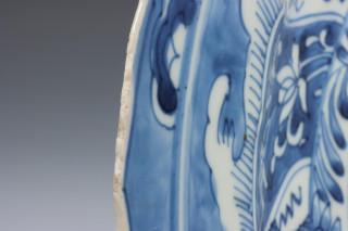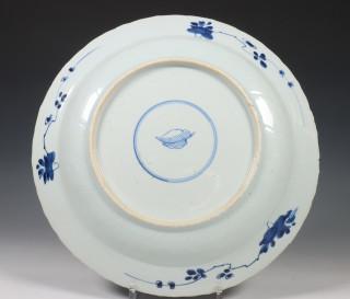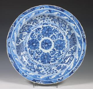 China, pair of blue and white porcelain 'lotus' dishes, Kangxi, both decorated with lotus surrounding a central lotus, encircled by a border of floral panels and a border of waves (hairline, small rim chips)