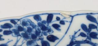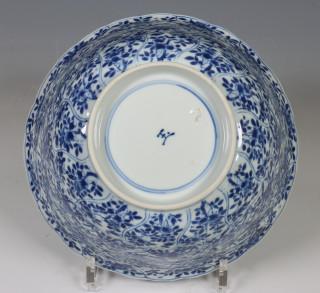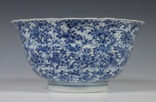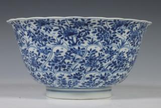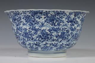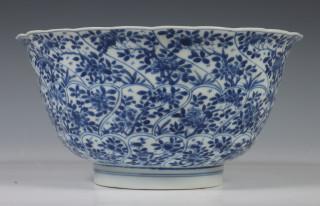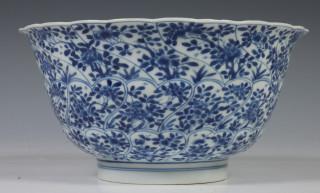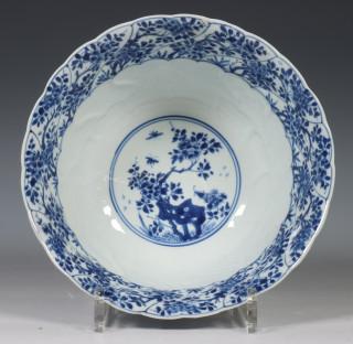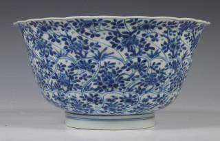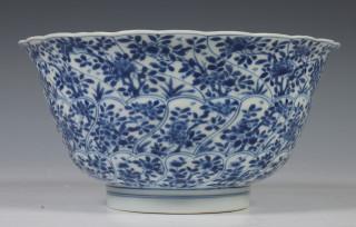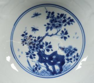 China, blue and white porcelain bowl, Kangxi, modelled and painted with floral panels, the base with 'yu' mark (small rim chip)
