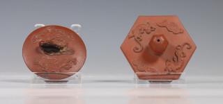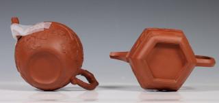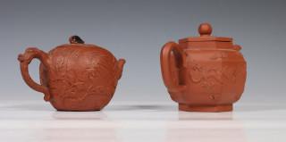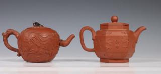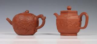 China, two Yixing earthenware teapots and covers, 18th century, one circular and modelled with phoenix, the other hexagonal and modelled with dragons (damages)