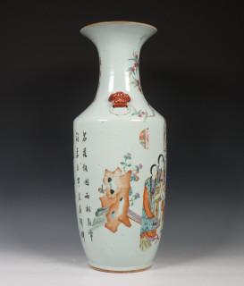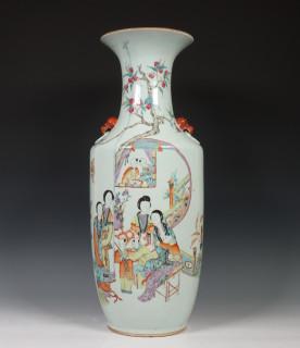 China, famille rose porcelain baluster vase, 19th century, decorated with ladies and boys in an interior and a calligraphy, the shoulder with two mask-and-ring handles (frits)