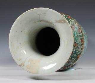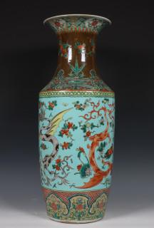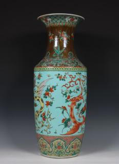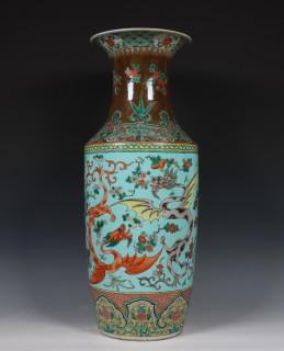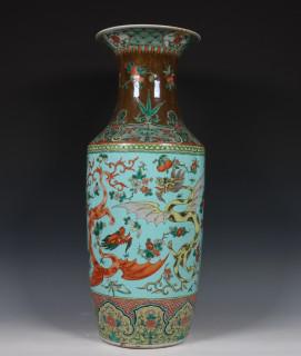 China, famille rose porcelain 'dragon' baluster vase, 19th century, decorated with two dragons between flowers on a turquoise ground (restored)