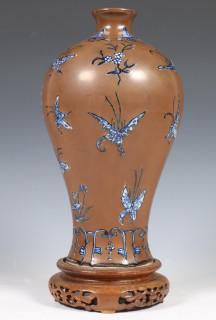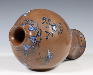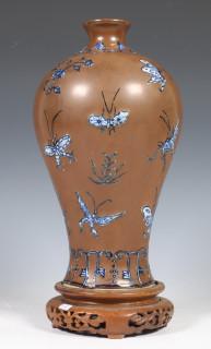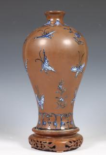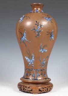 China, blue and white and brown-glazed porcelain meiping vase, 20th century, modelled and painted with butterflies and flowers, with apocryphal Qianlong mark, on wood stand