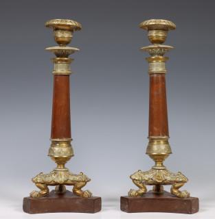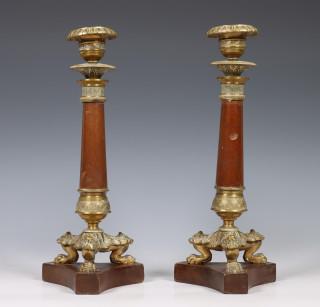 Stel bronzen met mahoniehouten éénlichts kandelaren, 19e eeuw.