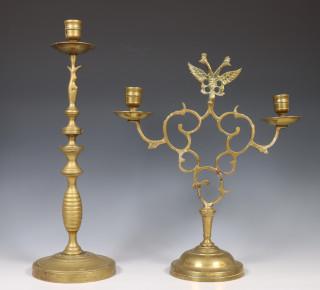 Hierbij een koperen éénlichts kandelaar op schijfvoet en een koperen tweelichts kandelaar met ornament met tweekoppige adelaar.