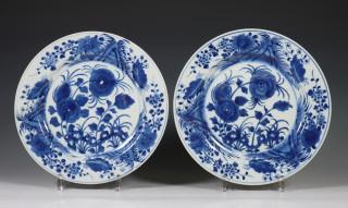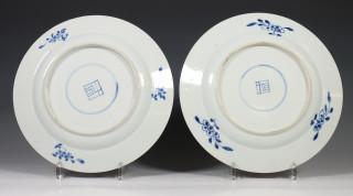 China, pair of blue and white porcelain plates, 20th century, decorated in 18th century style with flowers