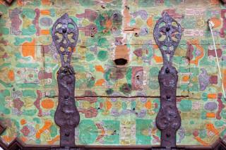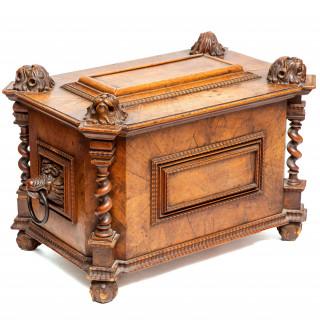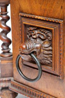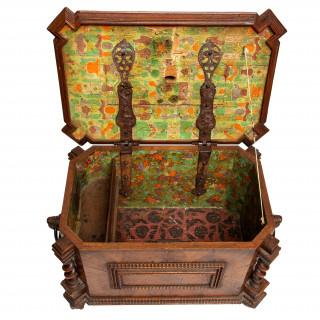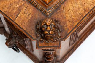 Op de hoeken getorste zuilen, deksel op elke hoek een leeuwenmasker, elke zijde met panelen met robbellijst. Op het deksel een schuifpaneel waaronder ruimte voor het slot (slot zelf ontbreekt) . Binnenzijde bekleed met handgekleurd brokaatpapier, gesmeed ijzeren beslag. Het Interieur met (latere) smeedijzeren binnenbak. Op balklauwpoten (lijstwerk mist bij achterpoot)