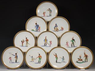met vergulde rand en elk met geschilderd decor van een militair spelend met een kind. Alle stukken met een andere voorstelling en andere militaire kostuums. Gemerkt en met (een kopje defect, een bord barst)