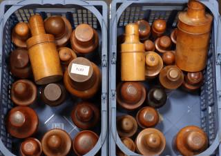 Collectie 'treenware' gedraaid houten apotheek fleshouders, 19e eeuw.