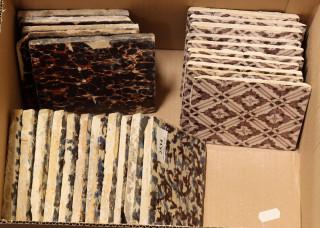 Hierbij zeven bruine schildpad tegels en tien mangaan tegels met ruitpatroon.