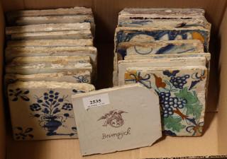 Met decor van o.a. bloemvazen en figuren. Hierbij negen diverse tegels uit tableau's en mangaan gekleurde tegel met wapen Beverwijk.