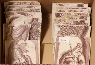 Twee mangaan gekleurde tegeltableaus, pilaren, 18e eeuw.