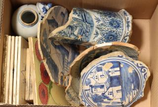 Onderdeel van een kaststel. Met decoratie van bloemen. Gemerkt de Klaauw. Hierbij blauw witte schotel fragmenten, een kleine dekselvaas en diverse 20e eeuwse tegels.