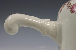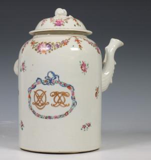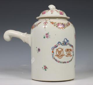 China, famille rose porcelain chocolate pot and cover, 18th century, decorated with flowers and two monograms (handle restored)