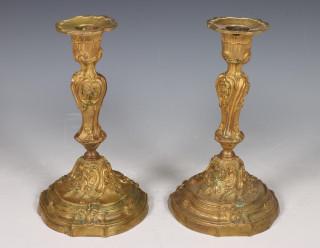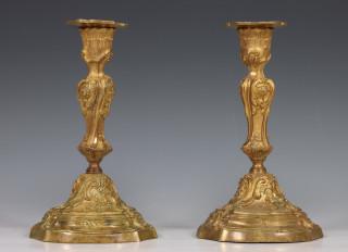 Frankrijk, paar vuurvergulde bronzen één lichts kandelaren, Louis XV stijl, 19e eeuw.