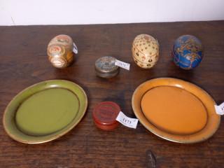 Drie blikken eieren met decoratie aan binnenzijde. Hierbij twee rondje doosjes en twee bordjes.