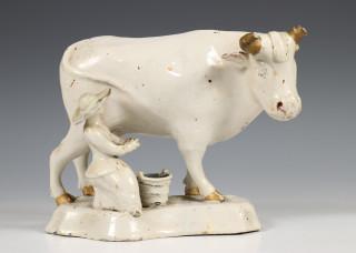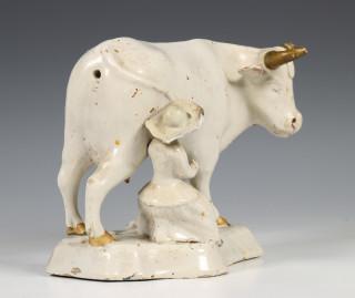 Delft, een witgeglazuurd aardewerken model van een melkmeid en koe, 18e eeuw,