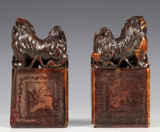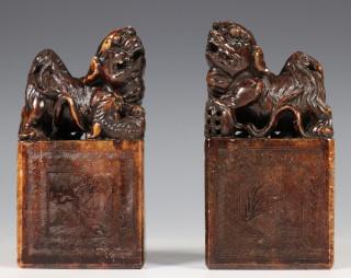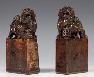 China, een paar stenen stempels met boeddhistische leeuwen en een kleine 'kylin' zegel, 20e eeuw,