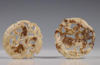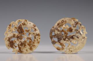 China, een paar opengewerkte cremekleurige jade plaquettes,