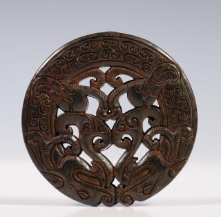 China, a carved stone archaistic plaque, carved with a stylised dragon, lingzhi and birds, the stone of a deep brown tone