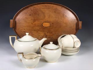 Bestaande uit koffiepot, suikerpot, melkkan, vier koppen en zes schotels. Hierbij een ovaal eikenhouten dienblad met intarsia. (scherf deksel koffiepot).