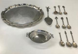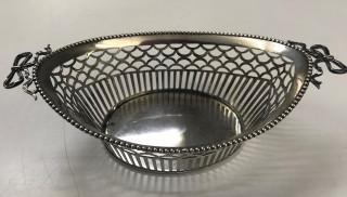 Hierbij een ajour gezaagd bonbonmandje met parelrand en strikken en een taartschep, suikerschep en 8 theelepels met Oud Hollands decor. Theelepels met defecten.