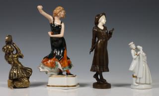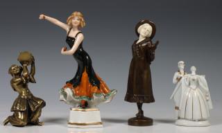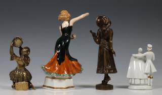 Hierbij porseleinen sculptuur van flamenco danseres, porseleinen sculptuur van paar, gemerkt Fraureuth en een messing sculptuur van zigeunerin met tamboerijn.