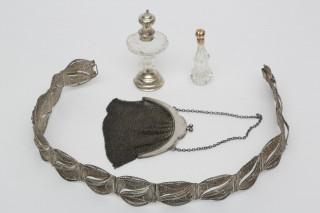 Damestasje, ceintuur, parfumflesje met gouden stop en kristallen strooier met zilveren stop.