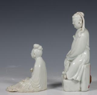 China, blanc-de-chine figure of Guandi and of Guanyin, late Qing dynasty, Guandi seated on a chair, with long robes and stern facial expression, Guanyin seated wearing flowing robes, holding a vase in her right hand (crack, chips)