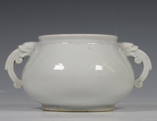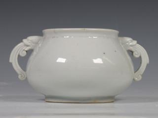 China, white-glazed porcelain censer, 18th century, the circular censer with two mask handles, the upper rim incised with ruyi-heads (cracks)