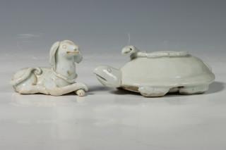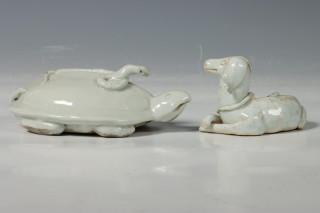 China, witgeglazuurd porseleinen model van een schildpad en een hond, 18e/19e eeuw,