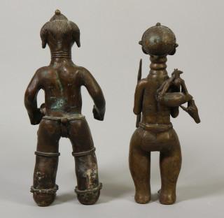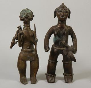 Benin, bronze couple; the man a hunter with prey, the woman with a rooster.