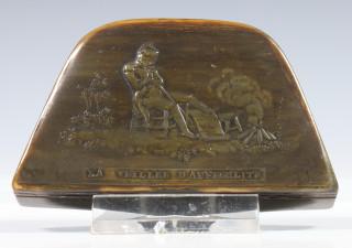 Horn snuff box formed as Napoleon's hat with scene on the lid, 19th century.