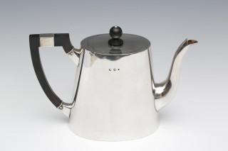 strak ovaal conisch model met gebogen tuit en voluutvormig ebbenhouten oor, met zilveren versiering, idem houten bolvormige knop op scharnierende deksel, mt. K.N.E.B van Kempen Begeer & Vos 1938 Voorschoten, 2e gehalte,