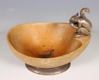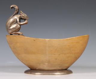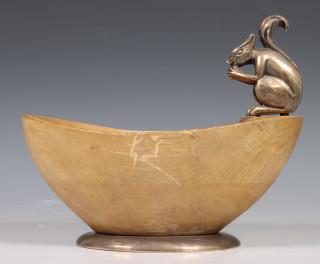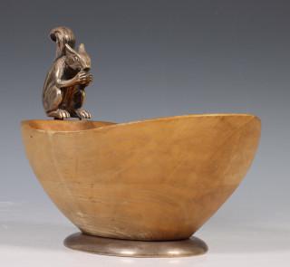 Engeland, beukenhouten walnotenschaal met zilveren sculptuur van eekhoorn, ca. 1930.