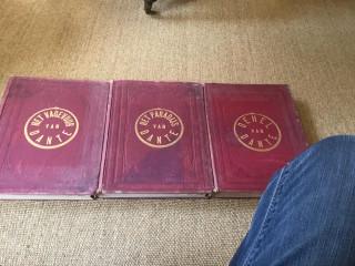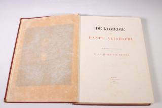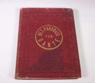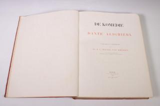 Dante Alighieri, "La divina Comedia" in drie losse boeken, allen met rode kaft, uitgave A.C. Kruseman, 1867-1873.