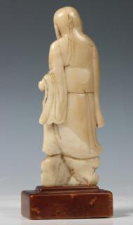 China, alabaster sculpture of an Immortal, 19th century, in standing position and dressed in long robes, on wood stand (damages and repair)