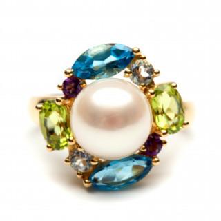 in het midden bezet met een parel, in een entourage van topazen, peridoot, amethist en aquamarijnen