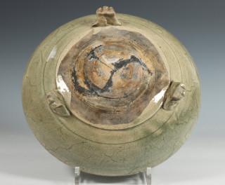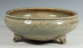 op drie klauwpootjes, de bolle zijden ingekerfd met vloeiende lijnen, bedekt met een gecraqueleerd lichtgroen glazuur (chips)