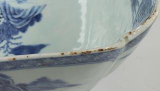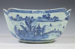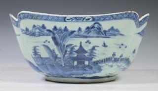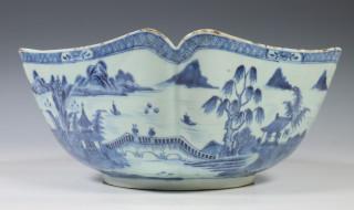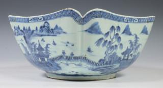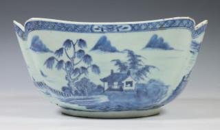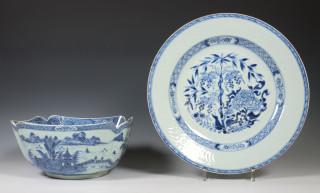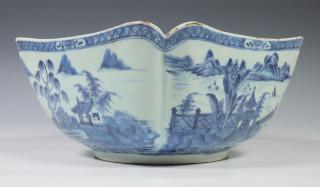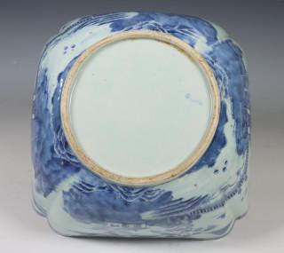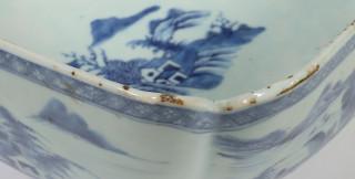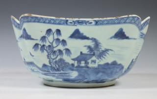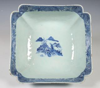 China, blauw-wit porseleinen kantige kom en schotel, Qianlong.
