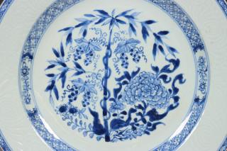 De kom met decor van bergmeer rondom (fritting, bakfoutjes). De schotel met druivenranken
