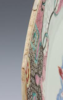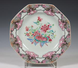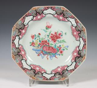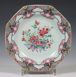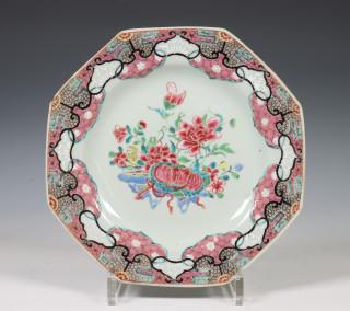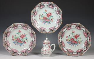 China, serie van drie famille rose borden en strooibus, Qianlong,