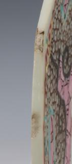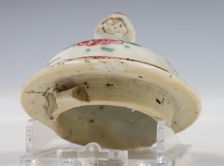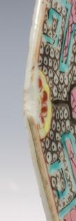 de borden met decor van pioenroos, rand met cartouches (alle fritting, schilfertjes, twee met haarscheur). De strooier met oor (bodem en deksel schilfertje, knop fritting)