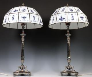 Paar glas in lood schermerlampen met verzilverde metalen voet.