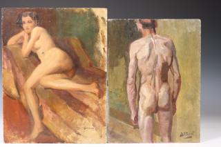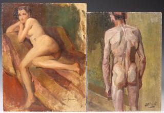 Zittend vrouwelijk naakt. Hierbij Staand mannelijk naakt door Henri Frederic Boot (1877-1963)